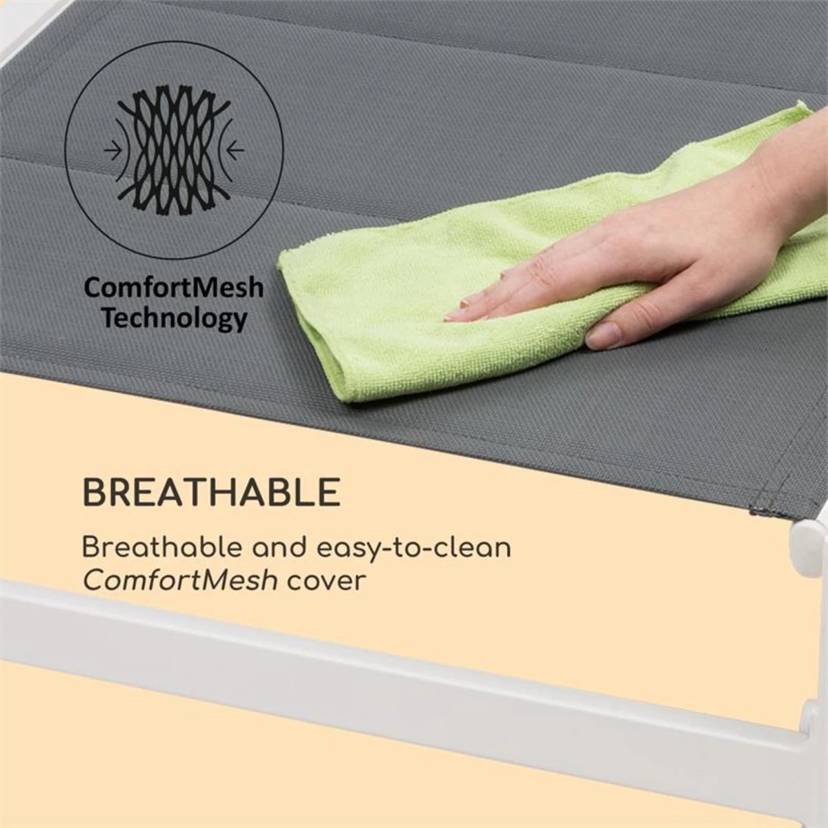 Comfortabel liggen of zitten dankzij beklede en luchtdoorlatende bespanning van pvc-polyester-ComfortMesh en rugleuning met 6 verstelbare standen.