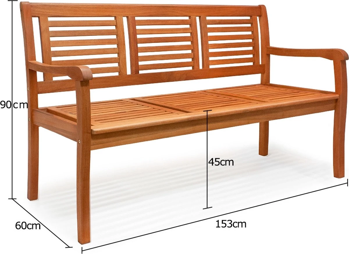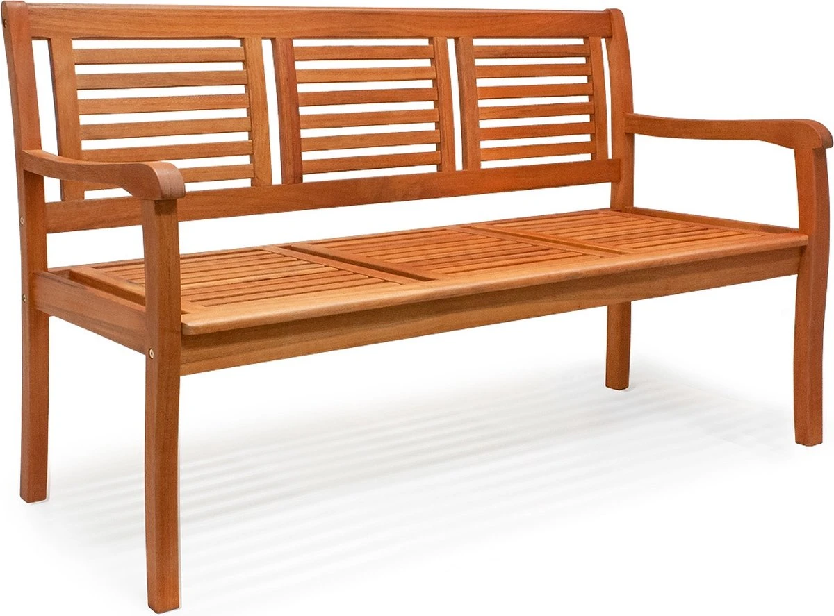 De weerbestendige 3-zits tuinbank is gemaakt van eucalyptushout en voorgeolied. Dankzij de rugleuning en de armleuningen is het comfortabel zitten. Ideaal voor balkon en terras. Maak het jezelf gemakkelijk en geniet van de zomer op het terras of in de tuin.