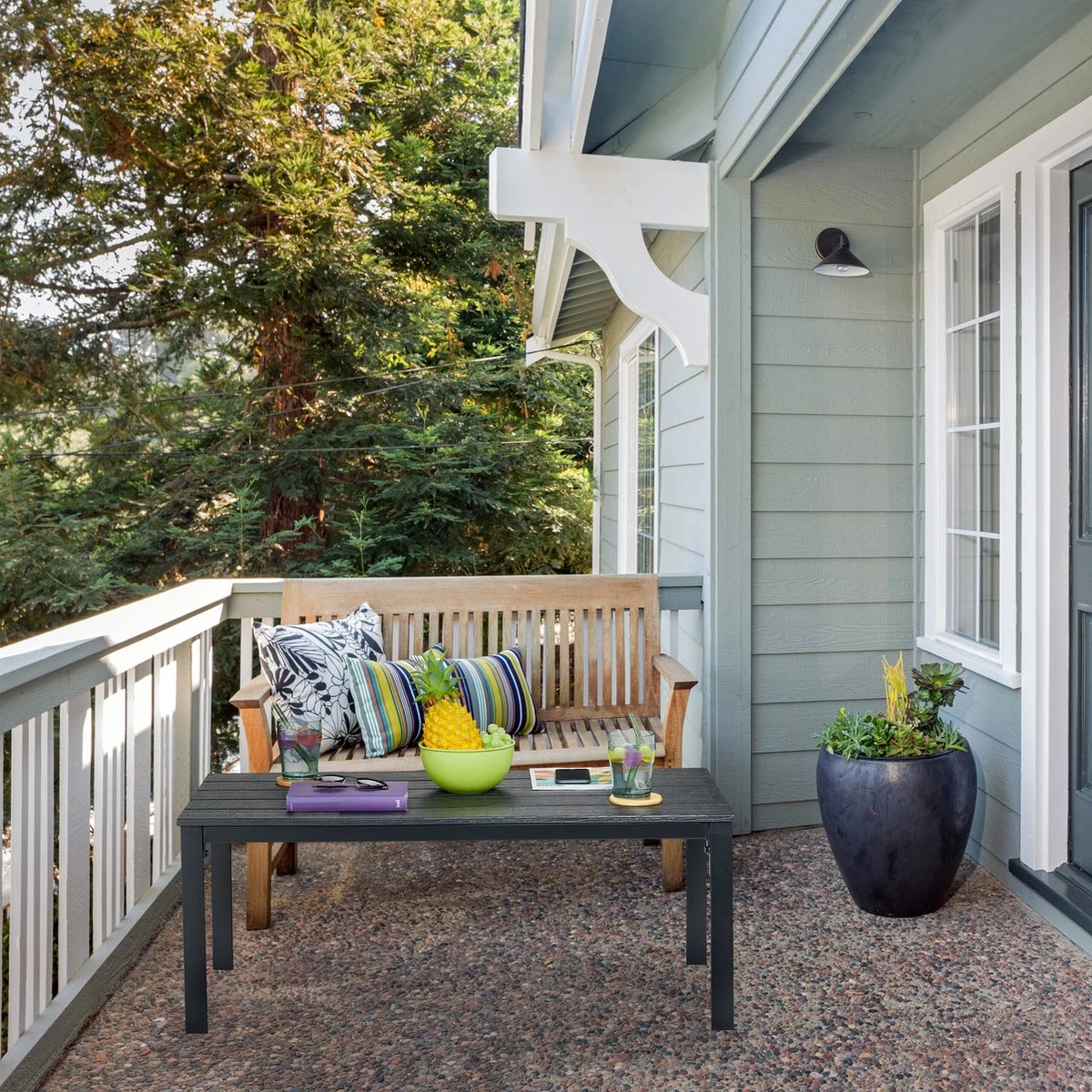 Deze rechthoekige buitentafel scoort door zijn simpele design en staat zowel leuk in de tuin, op een terras of op het balkon. Aan de lage eettafel kunnen 4 personen zitten en genieten van een heerlijk ontbijt of een kopje koffie. Het onderhoudsvriendelijke tafelblad dat lijkt op hout zorgt voor een gezellige sfeer en door het robuuste frame van metaal staat hij zeer stevig. Door zijn lage hoogte is de balkontafel ook heel geschikt als bijzettafel.